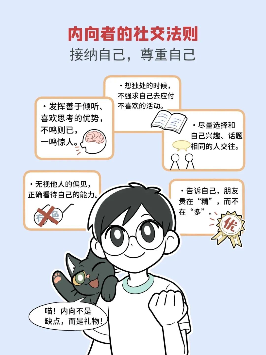 我们要做的就是鼓励孩子尊重自己的特点,引导和支持孩子在社交中树立自信和自尊。
