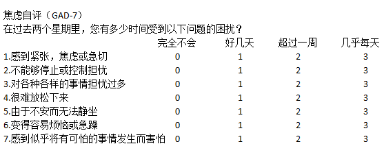 1、正常人在面对困难或有危险的任务,人们预感到不利情景的出现而产生的一种担忧、紧张、不安、恐惧、不愉快等的综合情绪体验。2、这种焦虑通常并不构成疾病,是一种正常的心理状态,是一种迎接挑战的驱动力和警觉力 。1、它是无缘无故出现的。没有明确的对象和内容,但是我们每天大部分的时间总惴惴不安,觉得有不好的事情将要发生,有种大难临头的感觉。2、这种焦虑是指向未来的。个体总感觉似乎某些威胁即将来临,但是却说不出究竟存在何种威胁或危险。3、病理性焦虑一般存在的时间比较长。且每天大部分的时间都处于这种状态。4、与焦虑情绪不同,处于病理性焦虑中的个体,发现自己很难控制住这种情绪。面对它时更多的是无助、混乱、不知所措,只能任由它来控制我们的情绪、行为等。5、它持续时间很长。如不进行积极有效的治疗,几周、几月甚至数年迁延难愈。病理性焦虑症除了呈现持续性或发作性惊恐状态外,同时伴多种躯体症状,如肌肉系统的肌肉酸痛、活动不灵活、肌肉及肢体的抽动、牙齿打颤、声音发抖等。感觉系统的视物模糊、忽冷忽热、软弱无力、浑身刺痛。心血管系统的心悸、胸痛、血管搏动感、昏倒感等。呼吸系统的胸闷、窒息感、叹息、呼吸困难等。胃肠消化系统的吞咽困难、嗳气、食欲不佳、消化不良、腹泻、便秘、体重减轻等。泌尿、生殖系统的尿频、尿急、停经、性冷淡、过早射精、勃起不能、阳痿等。植物神经系统症状口干、潮红、苍白、易出汗、易起“鸡皮疙瘩”、紧张性头痛、毛发竖起。简而言之,病理性焦虑是一种无根据的惊慌和紧张,心理上体验为泛化的、无固定目标的担心惊恐,生理上伴有警觉增高的躯体症状。(评分规则:每个条目0-3分,完全不会=0分,好几天=1分,超过一周=2分,几乎每天=3分,总分就是将7个条目的分值相加。)如果焦虑(GAD-7)得分小于10分,提示无或轻度焦虑情绪,可选择恰当的方法进行自我调节,这种心理状态就会得到好转;在10分以上提示中重度焦虑可能,建议及时寻求专业医生咨询或就诊。(提示:本测试用于自评,不代表诊断结果,如你发现你可能存在焦虑障碍,建议及时到院做进一步检查。)