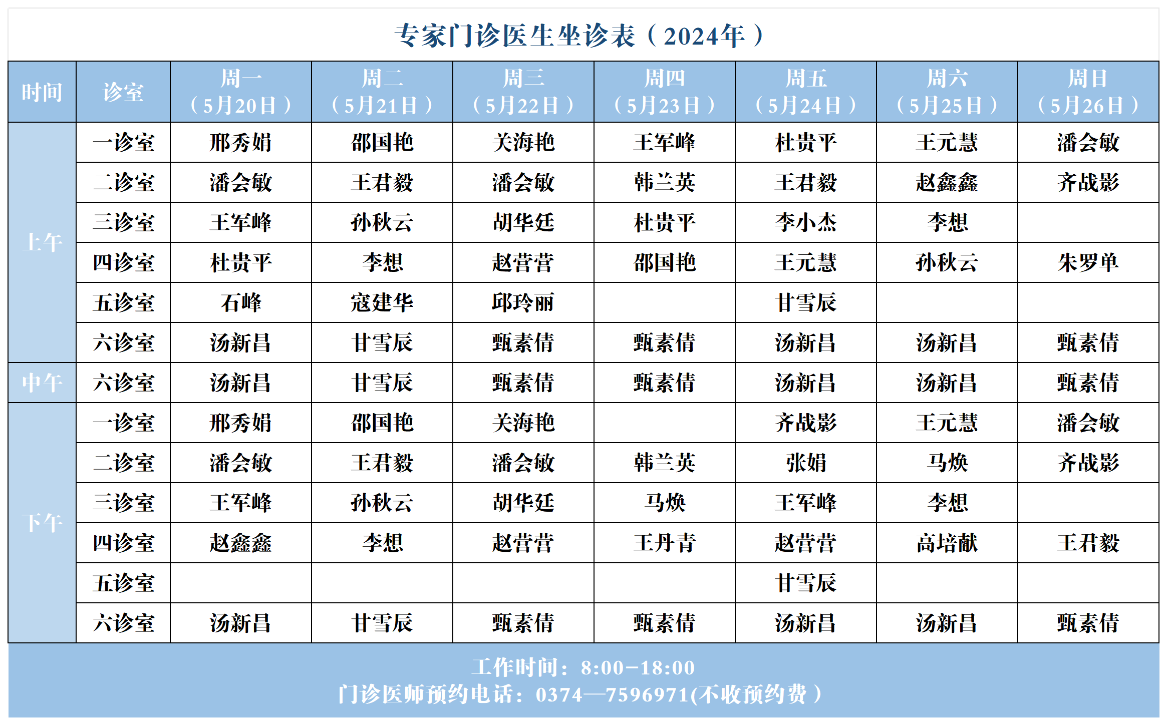 【坐诊信息】许昌市建安医院门诊坐诊表(2024年5月20日-5月26日)