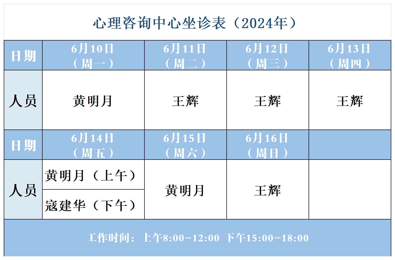 【坐诊信息】许昌市建安医院心理咨询中心坐诊表(2024年6月10日-6月16日)