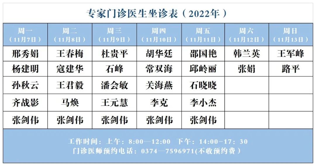 ? 根据目前疫情防控形势,我院门诊医生坐诊时间临时调整,来院就诊人员可提前拨打0374-7596971进行咨询和预约,谢谢!