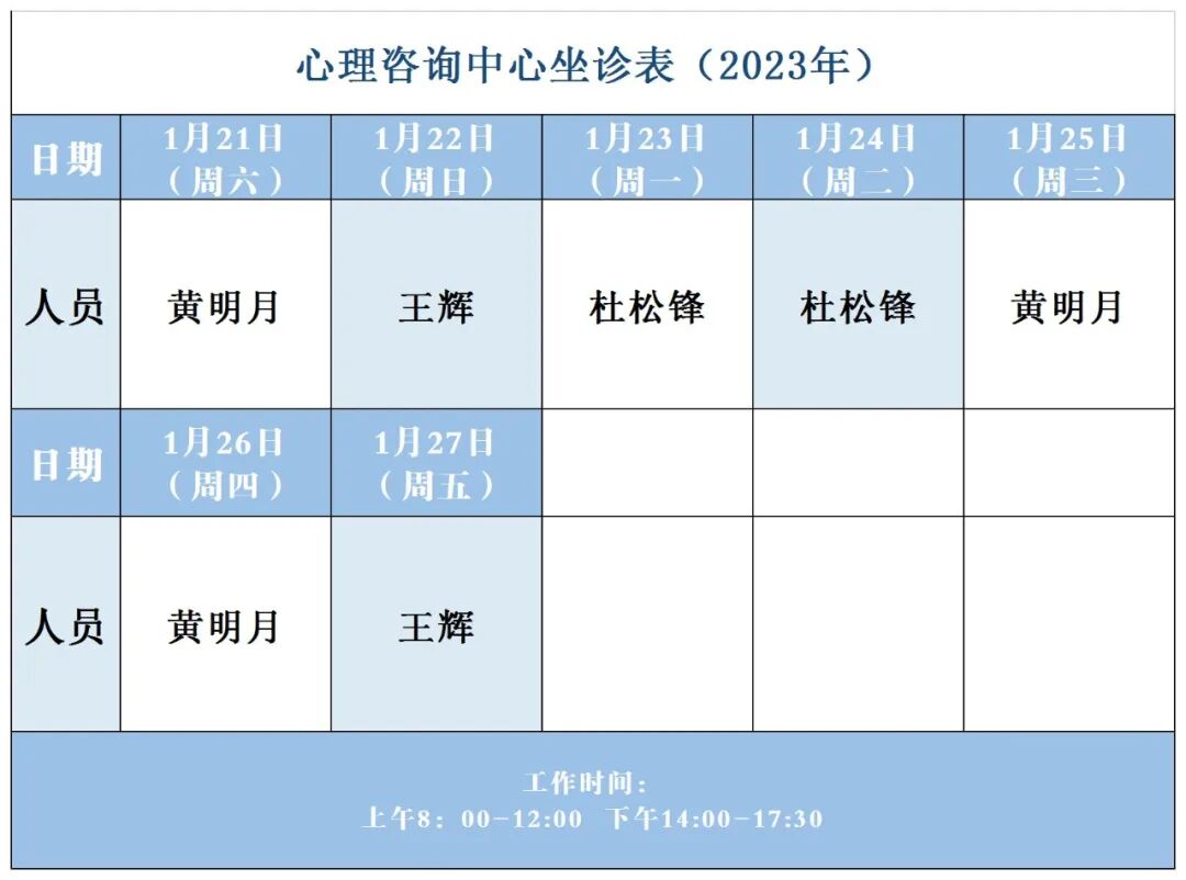 【坐诊信息】许昌市建安医院春节假期期间心理咨询中心坐诊表(2023年1月21日-2023年1月27日)