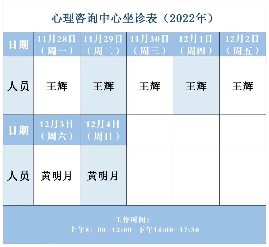 许昌市建安医院心理咨询中心坐诊表(2022年11月28日-12月4日)
