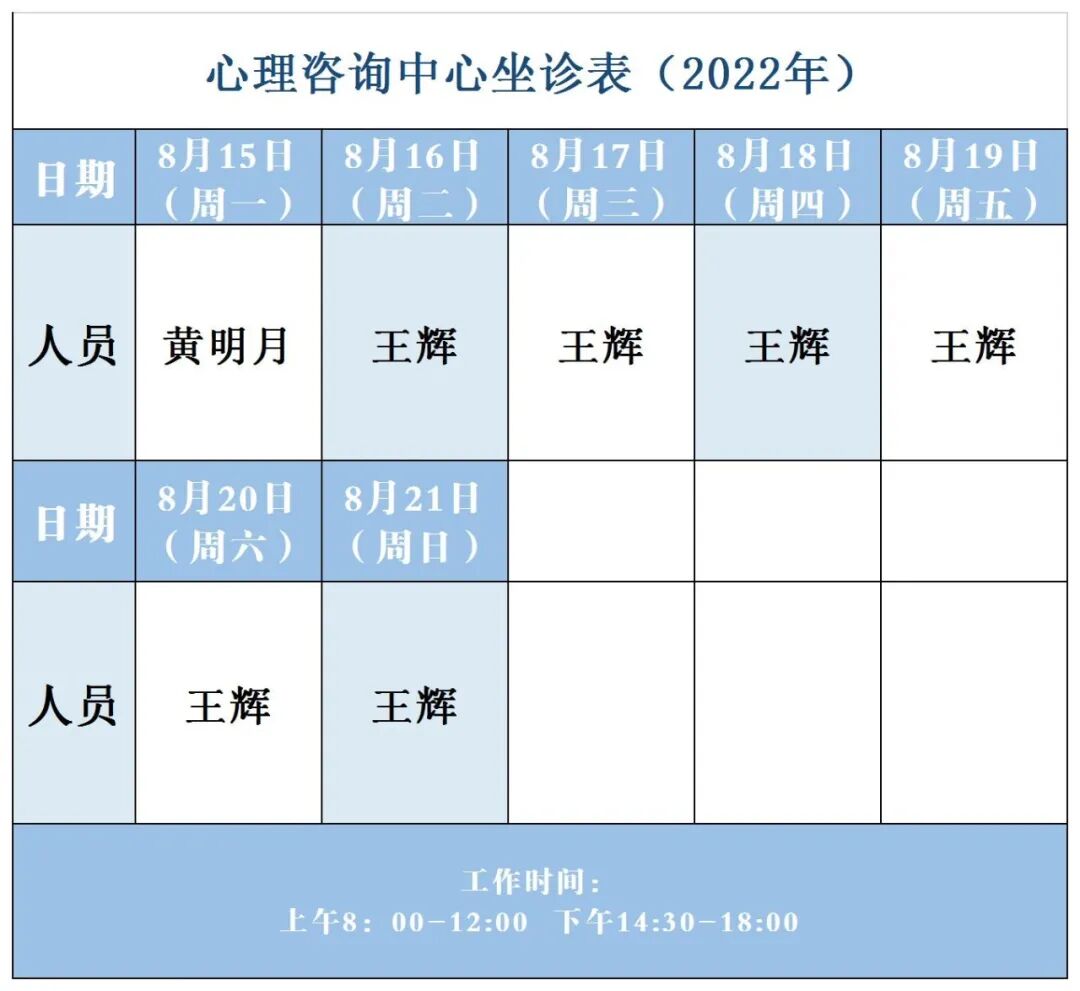 【坐诊信息】许昌市建安医院心理咨询中心坐诊表(2022年8月15日-8月21日)