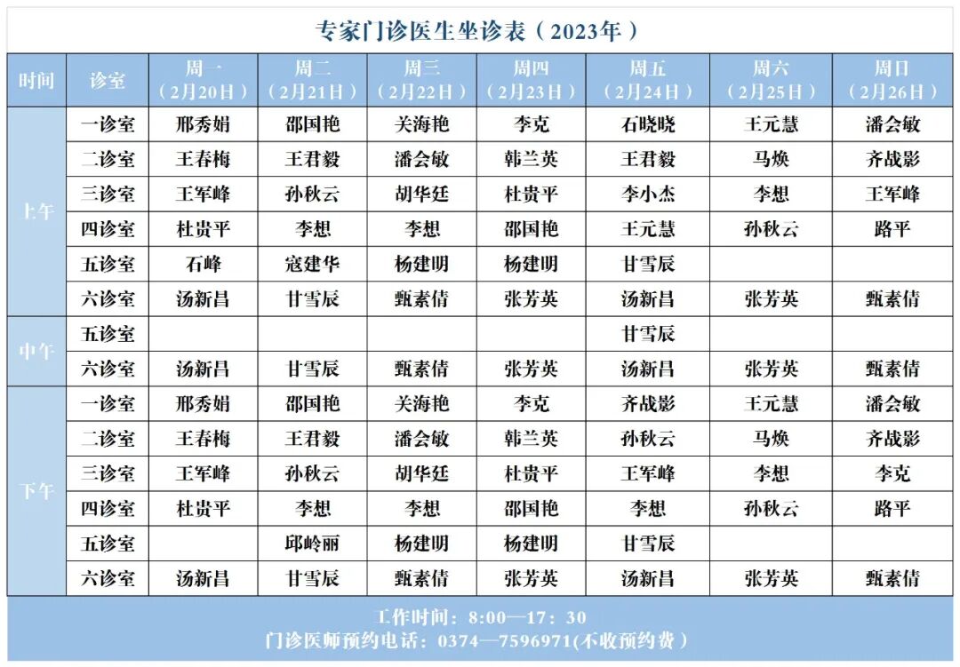 许昌市建安医院门诊坐诊表(2023年2月20日-2023年2月26日)