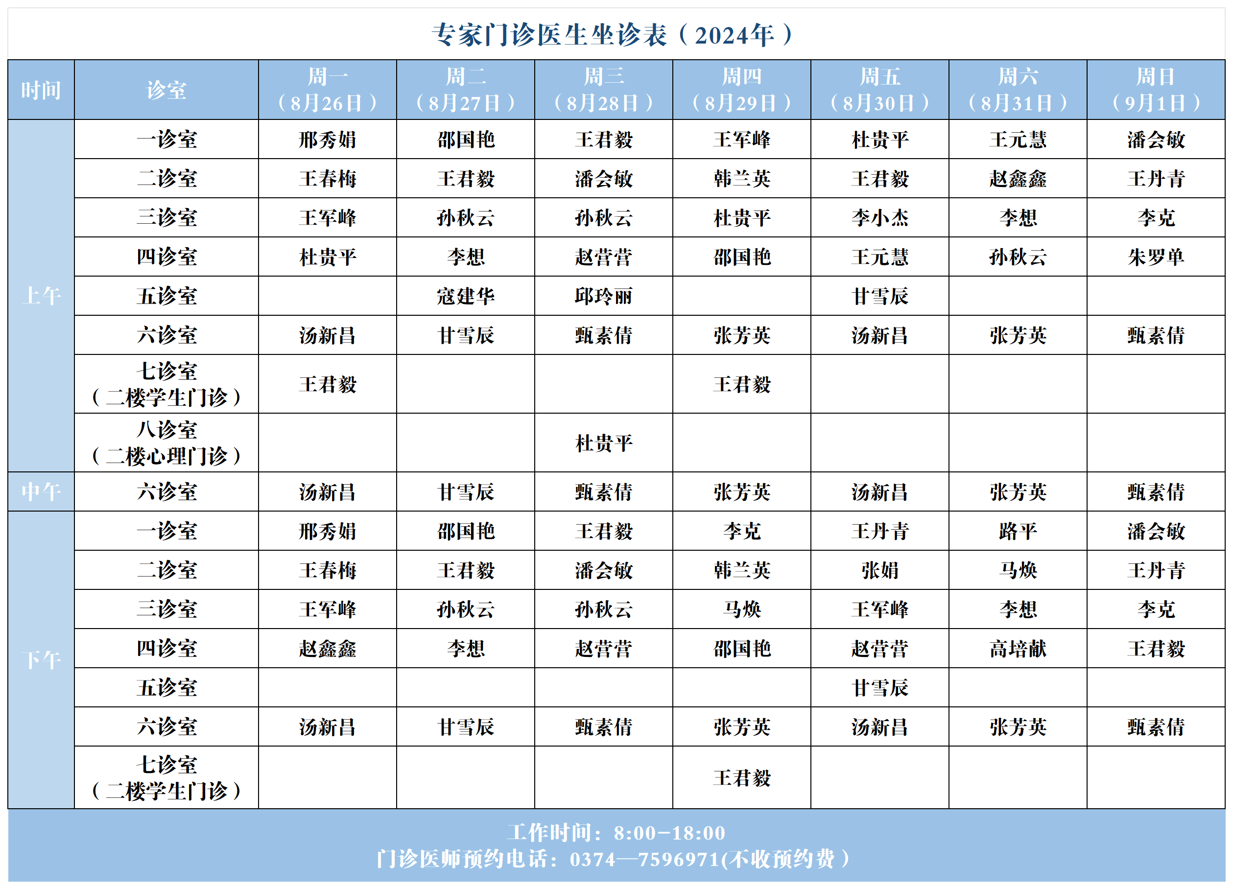 【坐诊信息】许昌市建安医院心理咨询中心坐诊表(2024年8月26日-9月1日)