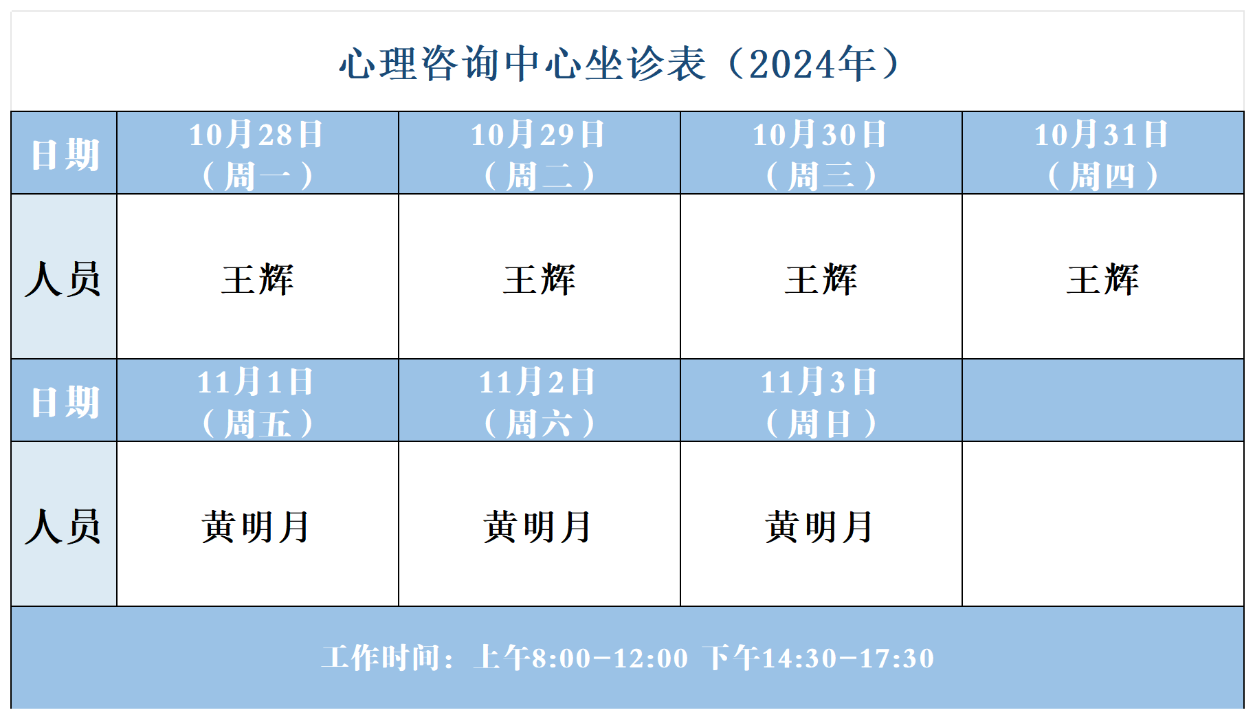 【坐诊信息】许昌市建安医院心理咨询中心坐诊表(2024年10月28日-11月3日)