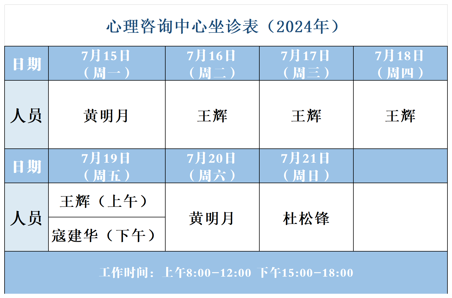 【坐诊信息】许昌市建安医院心理咨询中心坐诊表(2024年7月15日-7月21日)