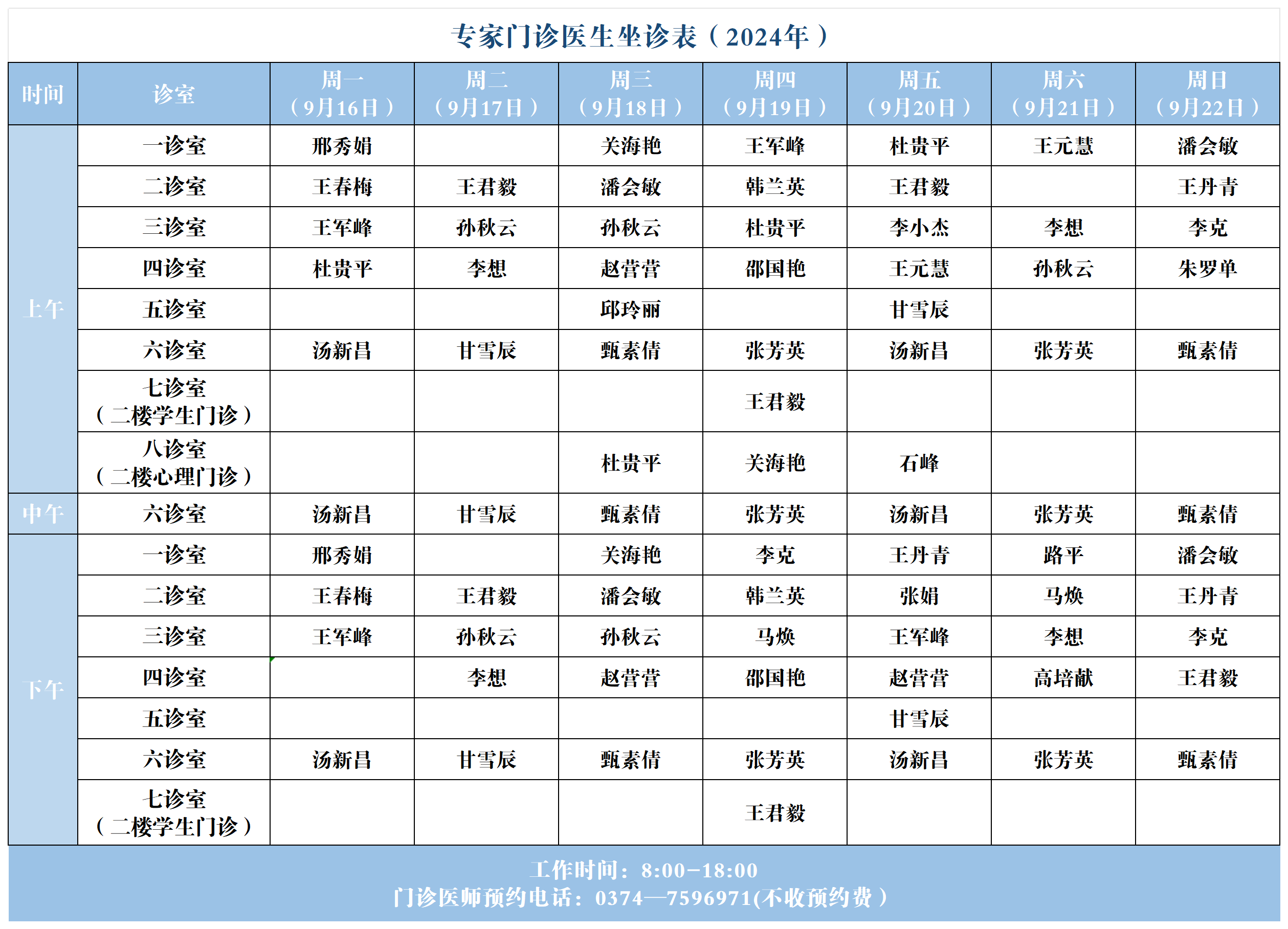 【坐诊信息】许昌市建安医院心理咨询中心坐诊表(2024年9月16日-9月22日)
