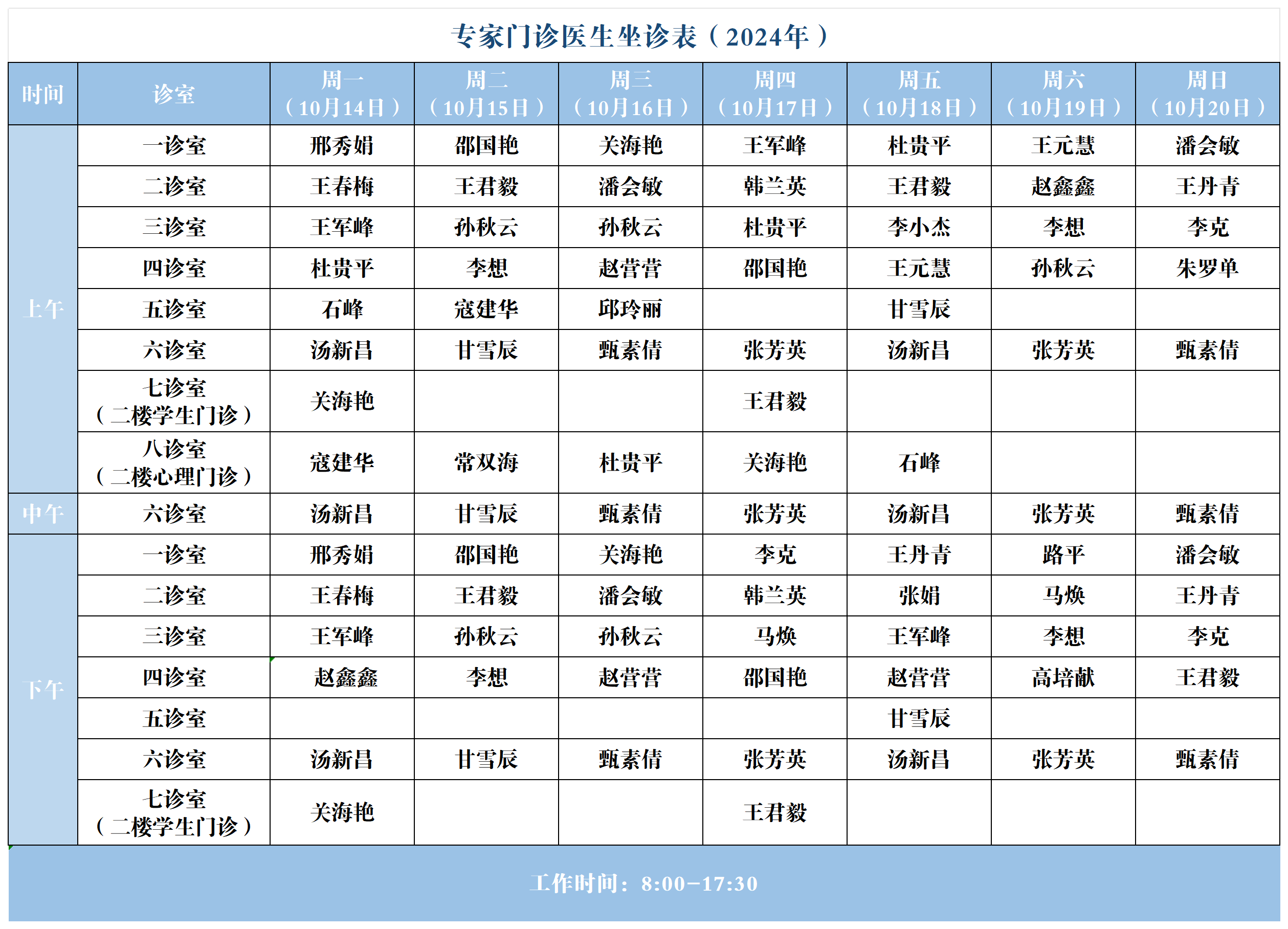 【坐诊信息】许昌市建安医院心理咨询中心坐诊表(2024年10月14日-10月20日)