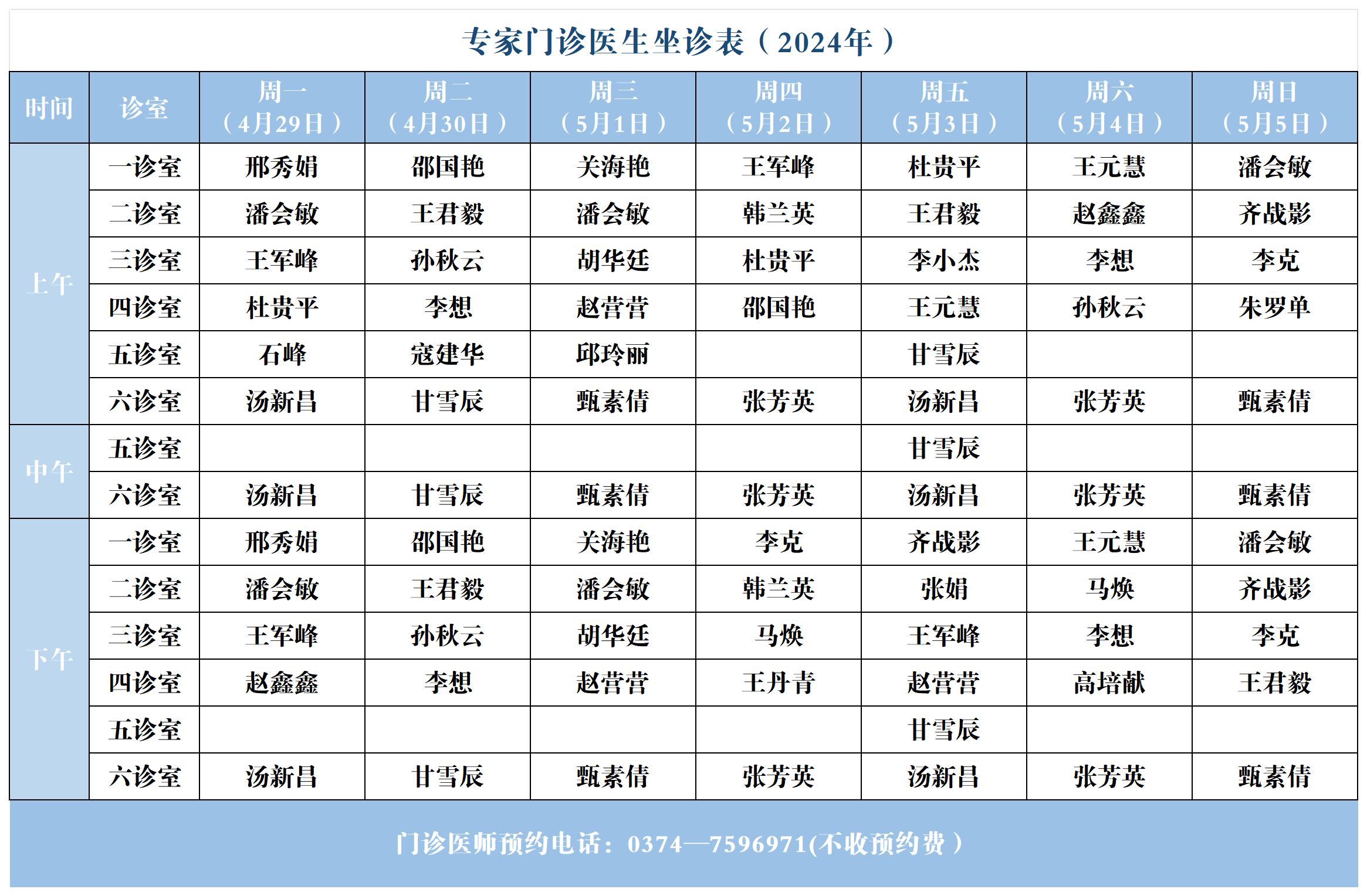 【坐诊信息】许昌市建安医院门诊坐诊表(2024年4月29日-5月5日)