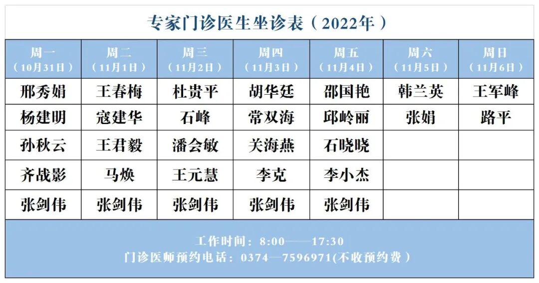 【坐诊信息】许昌市建安医院门诊坐诊表(2022年10月31日-11月6日)