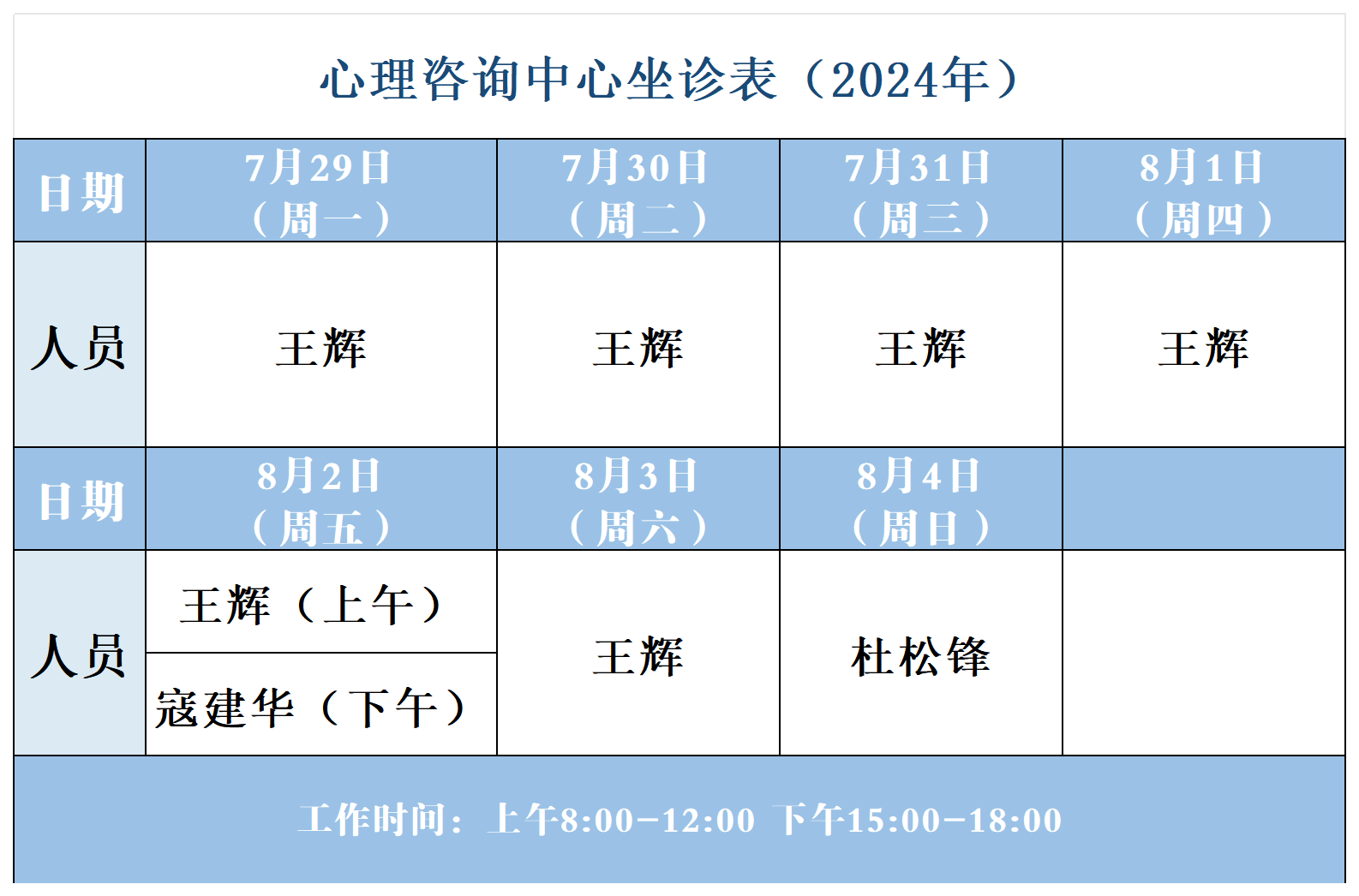 【坐诊信息】许昌市建安医院心理咨询中心坐诊表(2024年7月29日-8月4日)