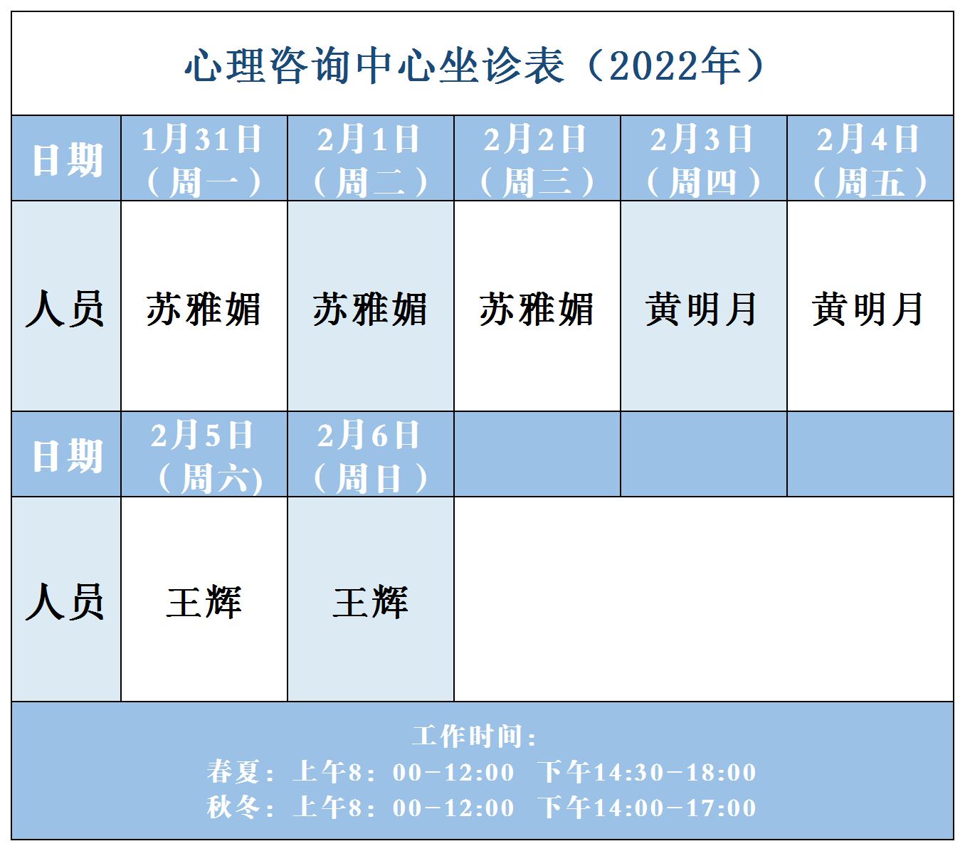 【坐诊信息】许昌市建安医院春节期间心理咨询中心坐诊表(2022年1月31日-2月6日)