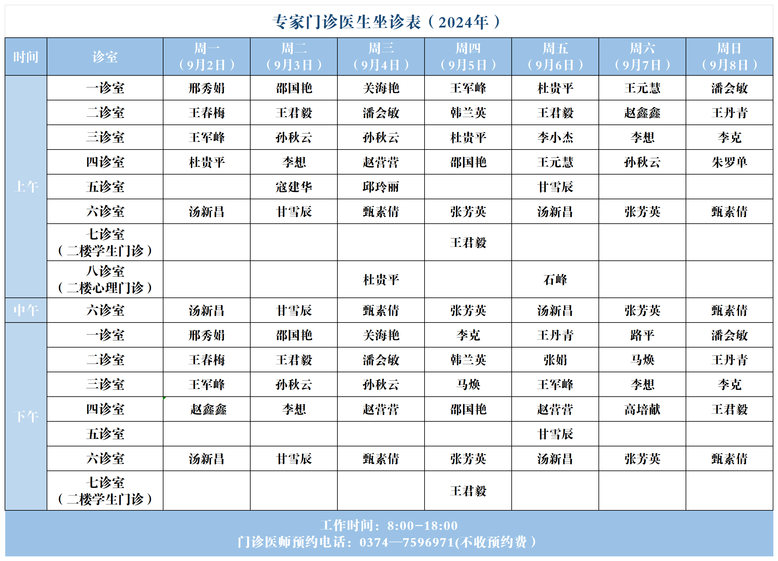【坐诊信息】许昌市建安医院门诊坐诊表(2024年9月2日-9月8日)