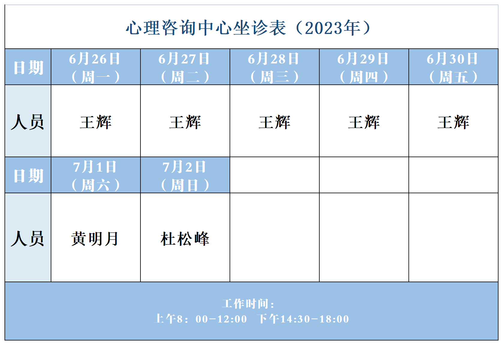 【坐诊信息】许昌市建安医院心理咨询中心坐诊表(2023年6月26日-2023年7月2日)