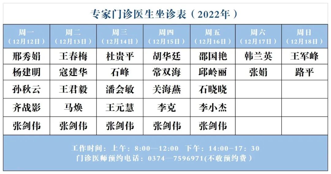 【坐诊信息】许昌市建安医院门诊坐诊表(2022年12月12日-12月18日)