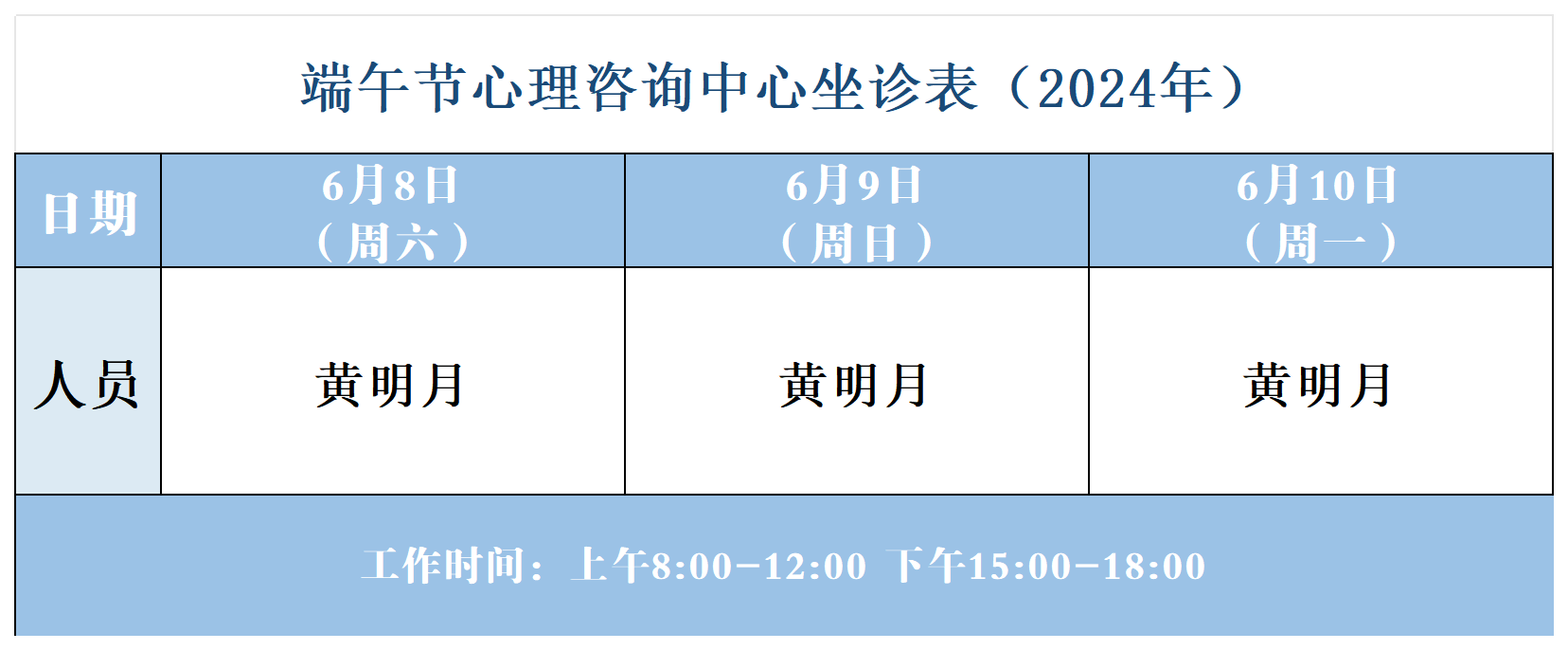 【坐诊信息】许昌市建安医院端午节假期期间心理咨询中心坐诊表(2024年6月8日-6月10日)