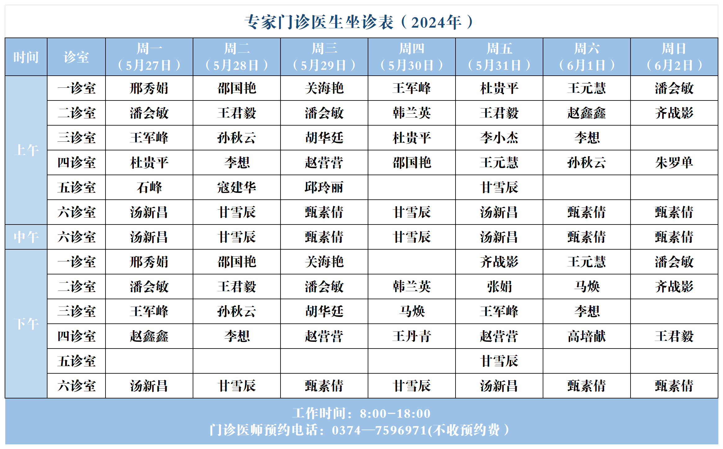 【坐诊信息】许昌市建安医院门诊坐诊表(2024年5月27日-6月2日)