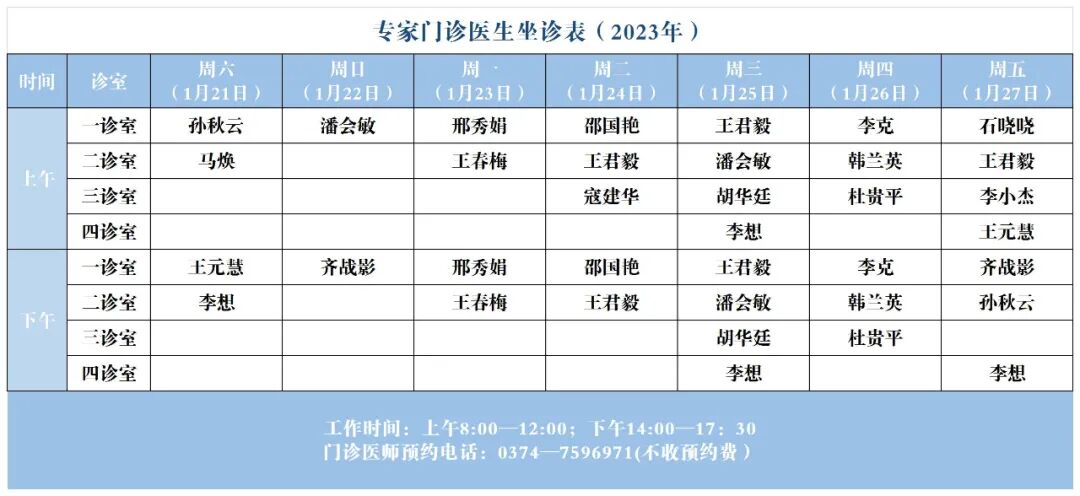 【坐诊信息】许昌市建安医院春节假期期间门诊坐诊表(2023年1月21日-2023年1月27日)