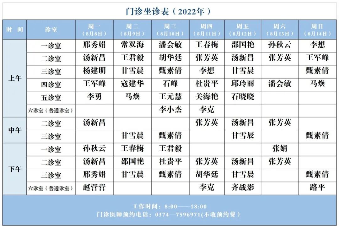 【坐诊信息】许昌市建安医院门诊坐诊表(2022年8月8日-8月14日)