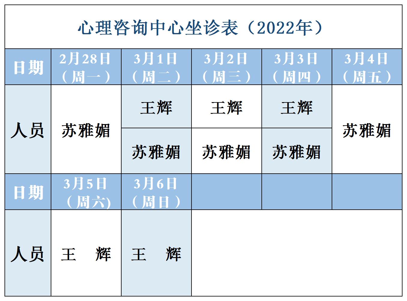 【坐诊信息】许昌市建安医院心理咨询中心坐诊表(2022年2月28日-3月6日)