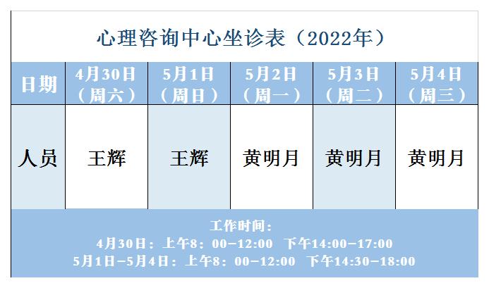 【坐诊信息】许昌市建安医院心理咨询中心坐诊表(2022年4月30日-5月4日)