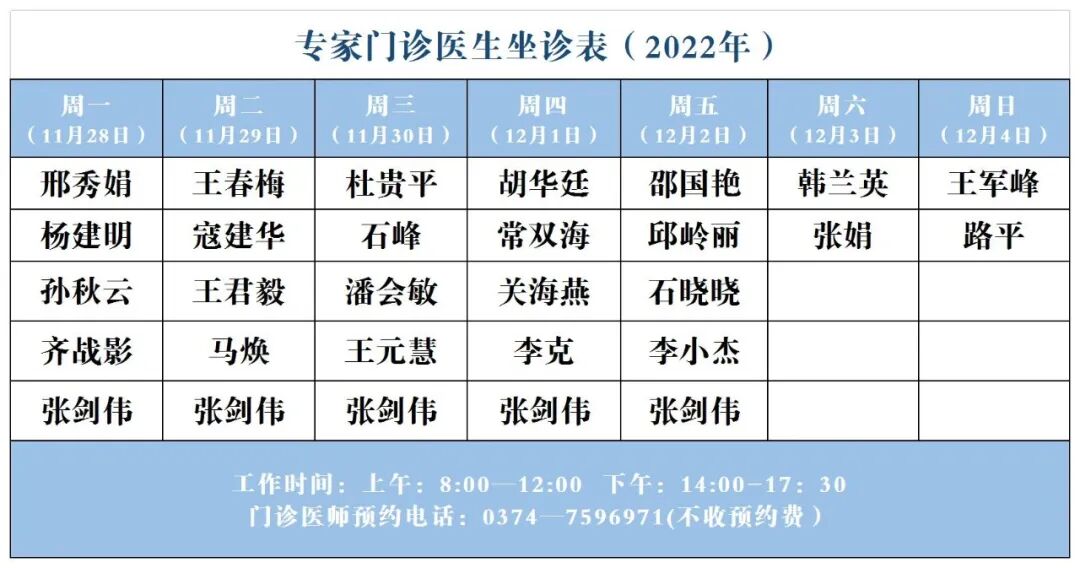 根据目前疫情防控形势,我院门诊医生坐诊时间临时调整,来院就诊人员可提前拨打0374-7596971进行咨询和预约,谢谢!