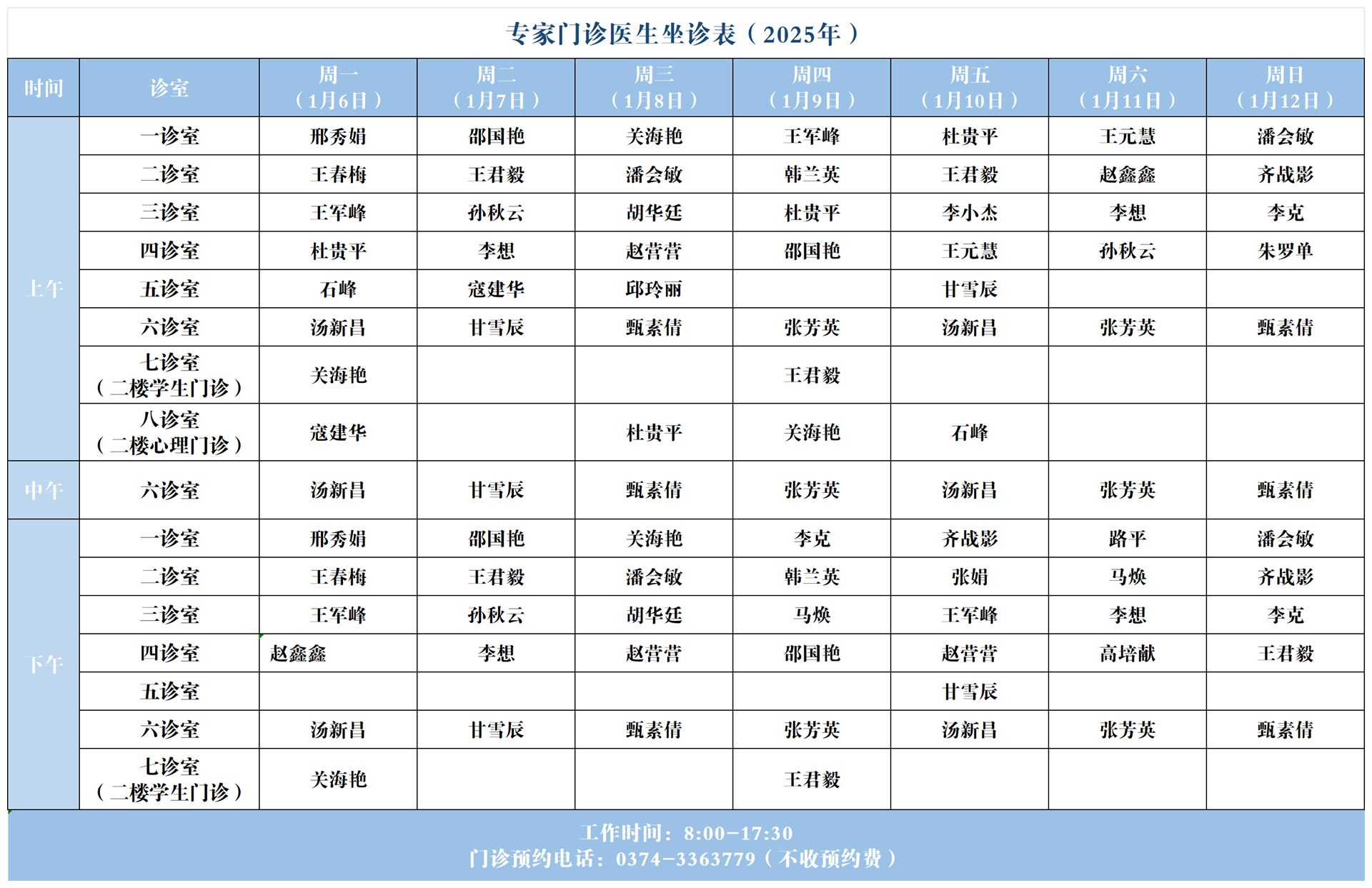 【坐诊信息】许昌市建安医院心理咨询中心坐诊表(2025年1月6日-1月12日)