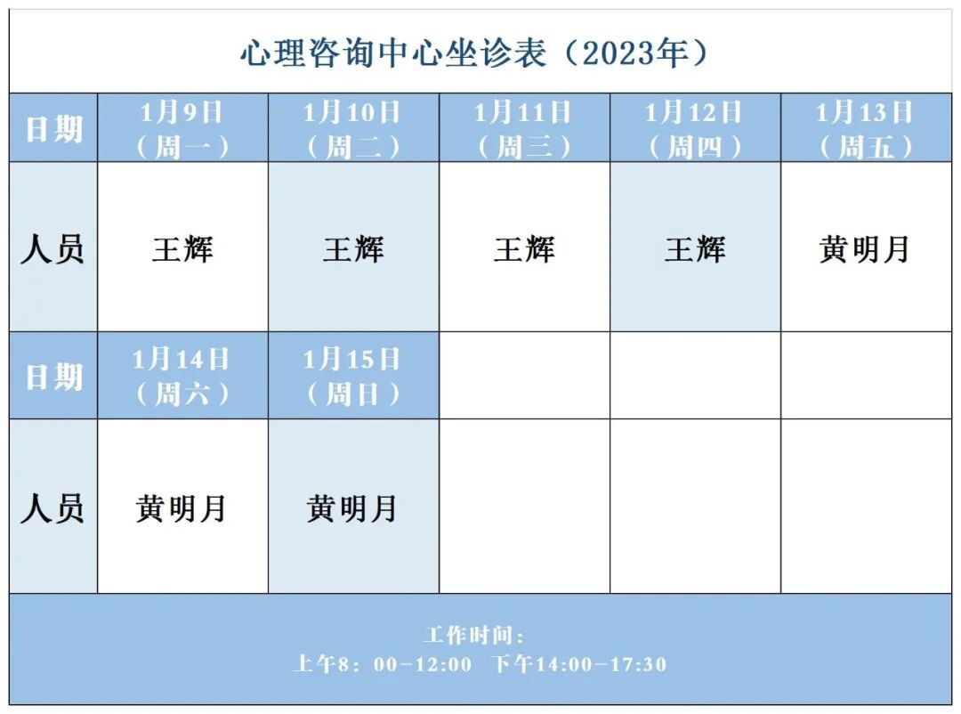 【坐诊信息】许昌市建安医院心理咨询中心坐诊表(2023年1月9日-2023年1月15日)