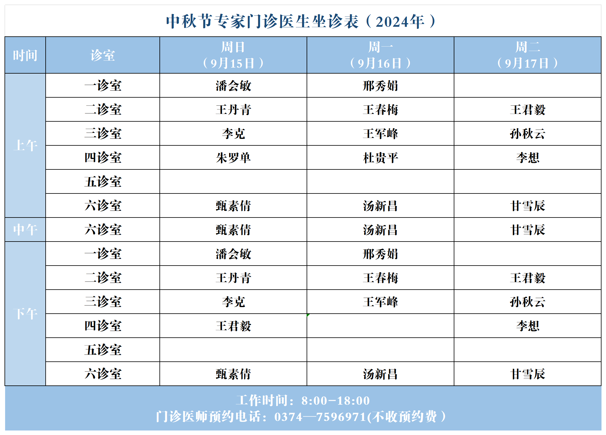 【坐诊信息】许昌市建安医院中秋节门诊坐诊表(2024年9月15日-9月17日)