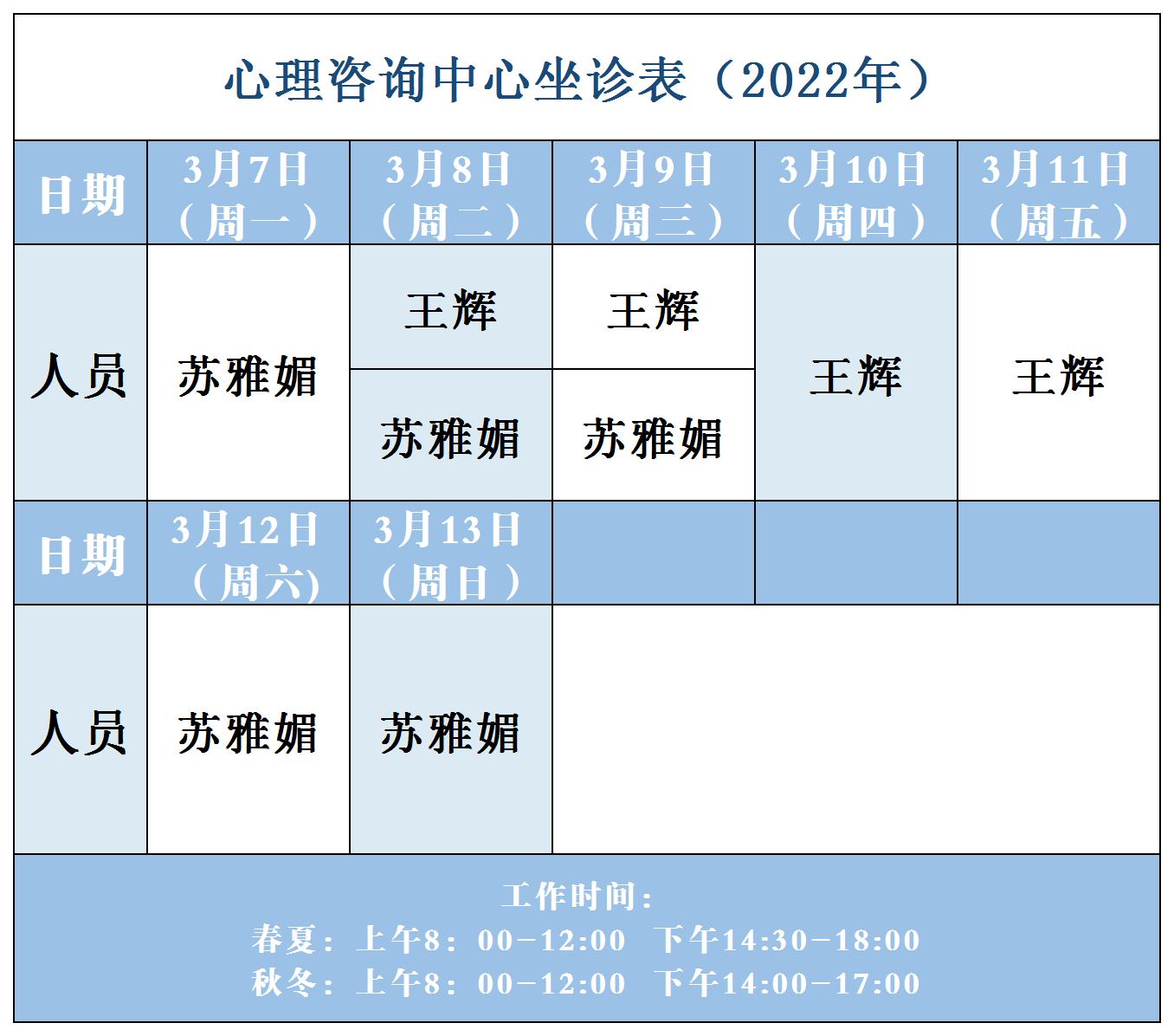 【坐诊信息】许昌市建安医院心理咨询中心坐诊表(2022年3月7日-3月13日)