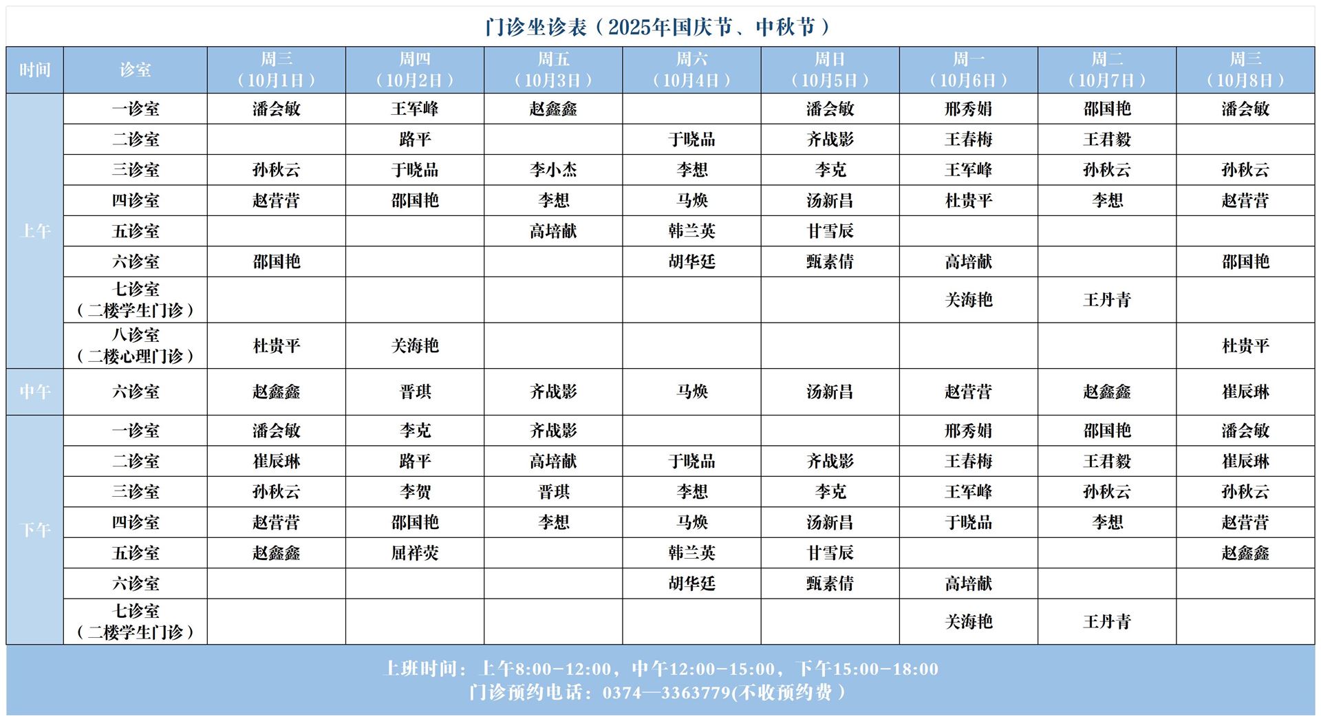 【坐诊信息】许昌市心理健康服务中心(东区门诊)国庆节、中秋节坐诊表(2025年10月1日-10月8日)