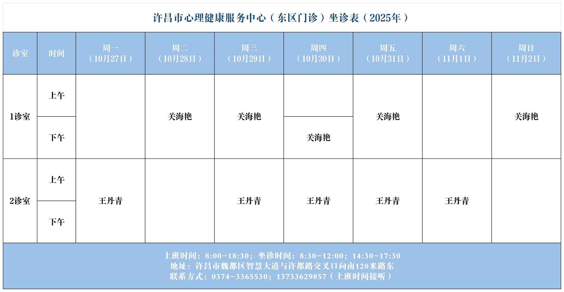 【坐诊信息】许昌市心理健康服务中心(东区门诊)坐诊表(2025年10月27日-11月2日)