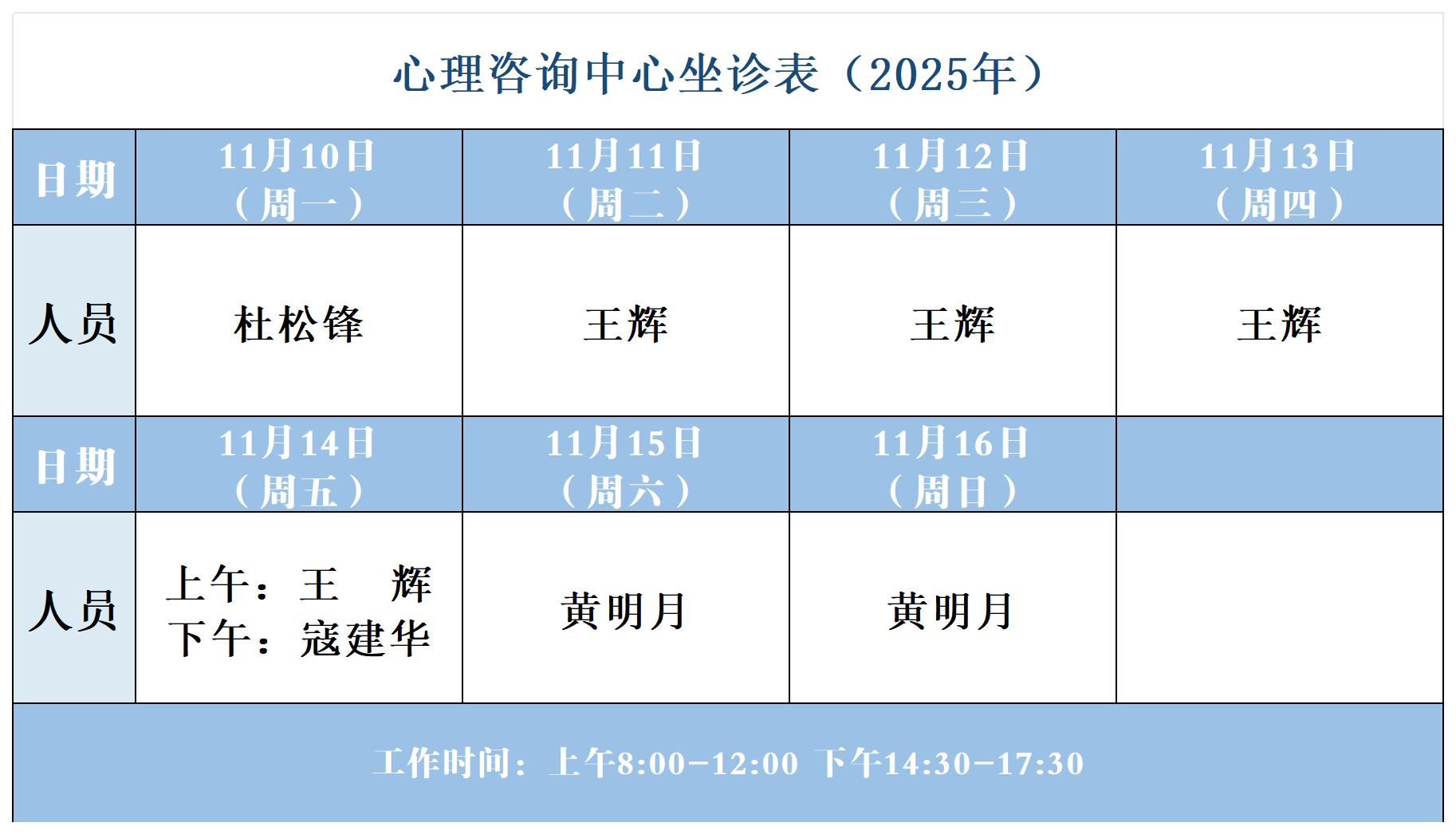 【坐诊信息】许昌市建安医院心理咨询中心坐诊表(2025年11月10日-11月16日)