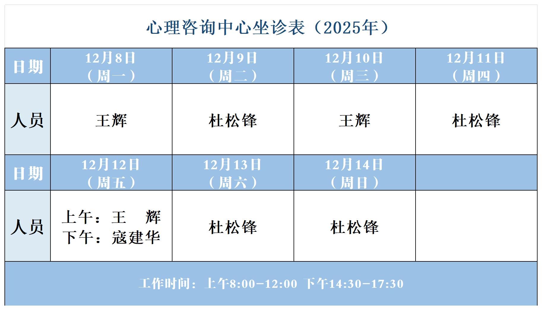 【坐诊信息】许昌市建安医院心理咨询中心坐诊表(2025年12月8日-12月14日)