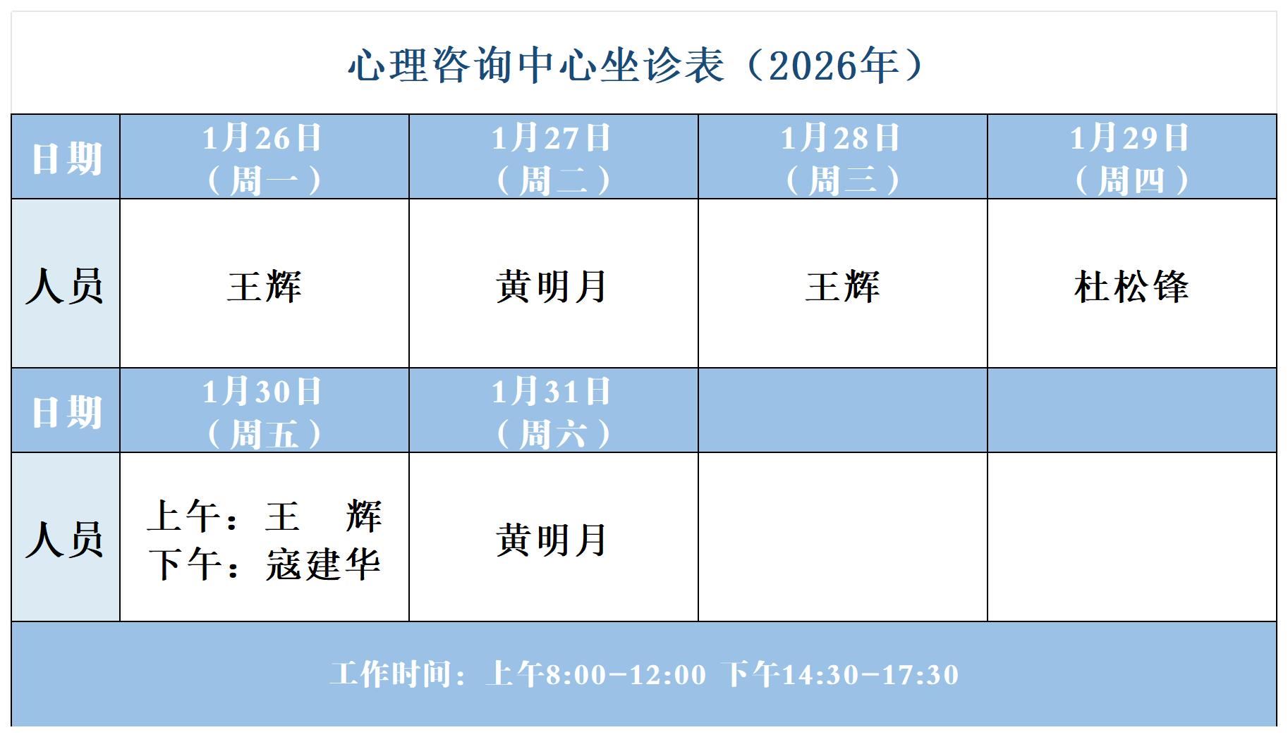 【坐诊信息】许昌市建安医院心理咨询中心坐诊表(2026年1月26日-2026年1月31日)