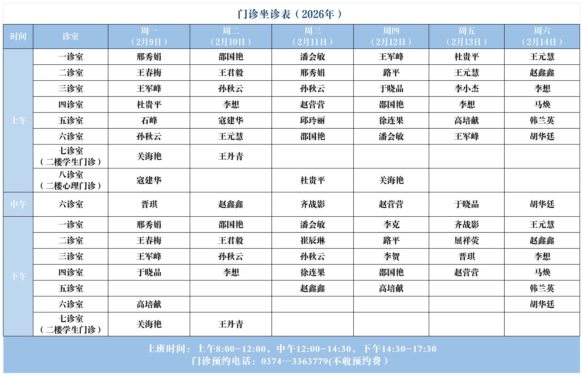 【坐诊信息】许昌市心理健康服务中心(东区门诊)坐诊表(2026年2月9日-2026年2月15日)