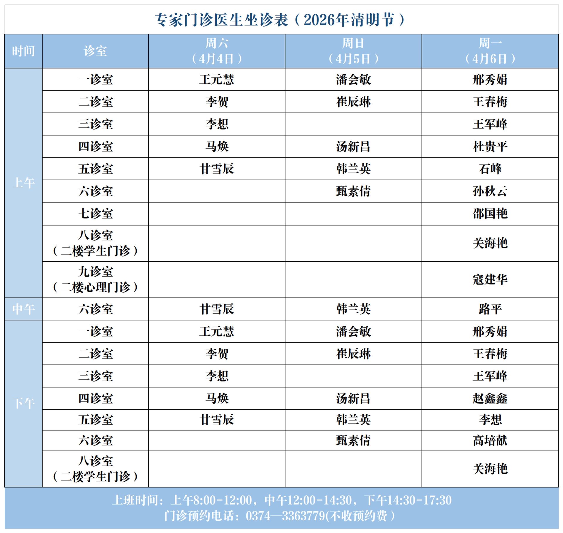 【坐诊信息】许昌市心理健康服务中心(东区门诊)清明节坐诊表(2026年4月4日-2026年4月6日)