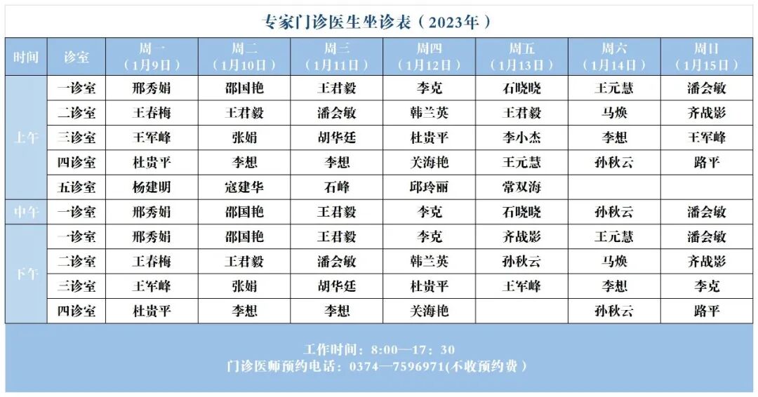 【坐诊信息】许昌市建安医院门诊坐诊表(2023年1月9日-2023年1月15日)