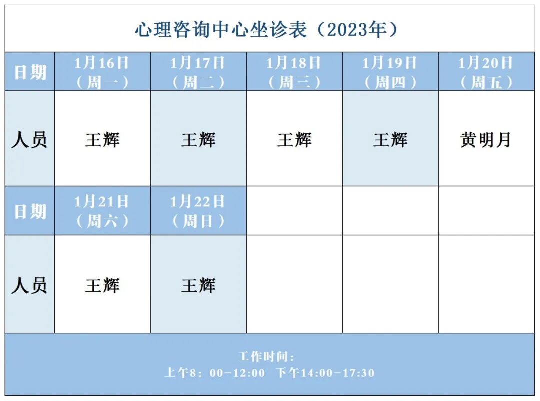 【坐诊信息】许昌市建安医院心理咨询中心坐诊表(2023年1月16日-2023年1月22日)