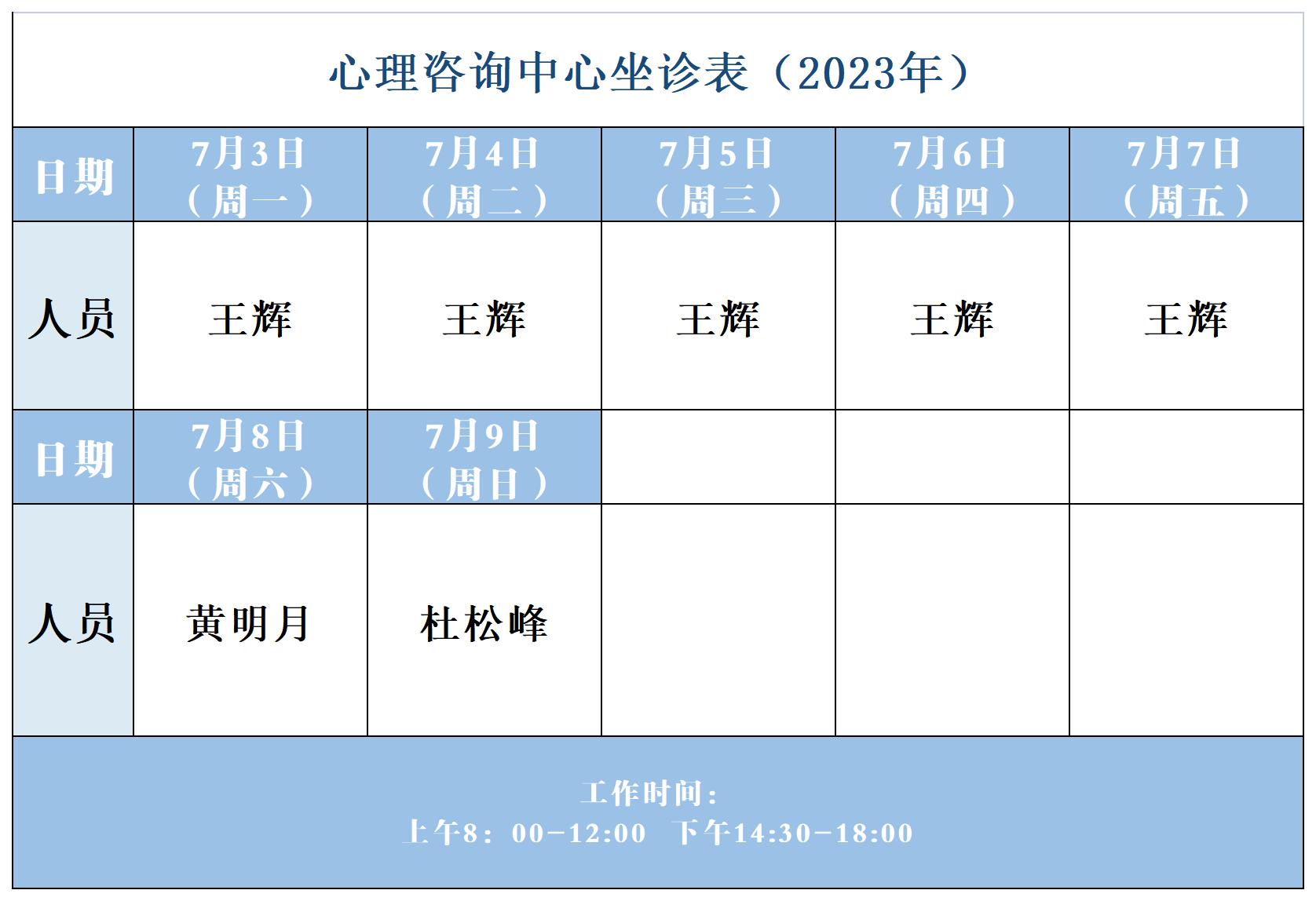 【坐诊信息】许昌市建安医院心理咨询中心坐诊表(2023年7月3日-2023年7月9日)