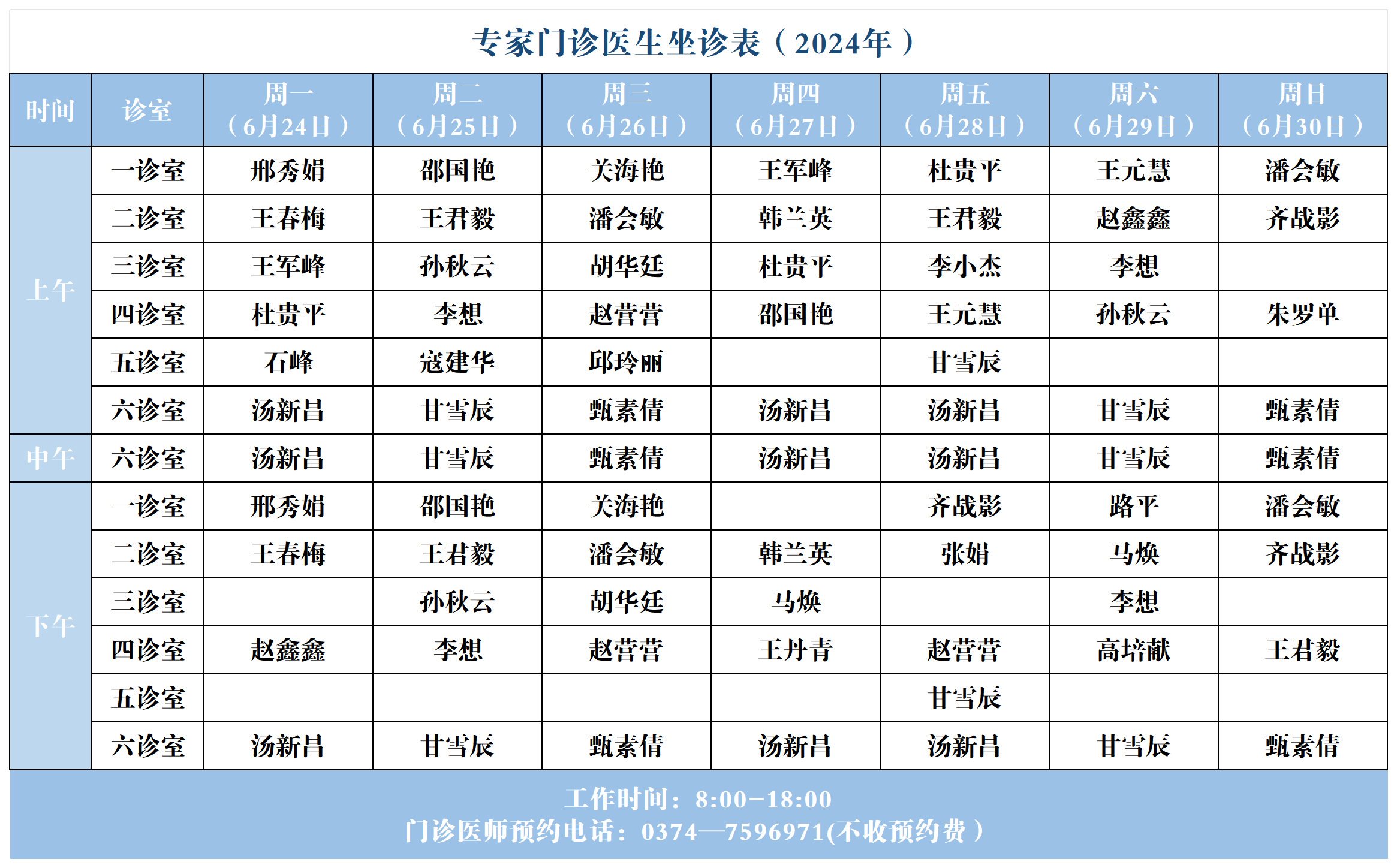 【坐诊信息】许昌市建安医院门诊坐诊表(2024年6月24日-6月30日)