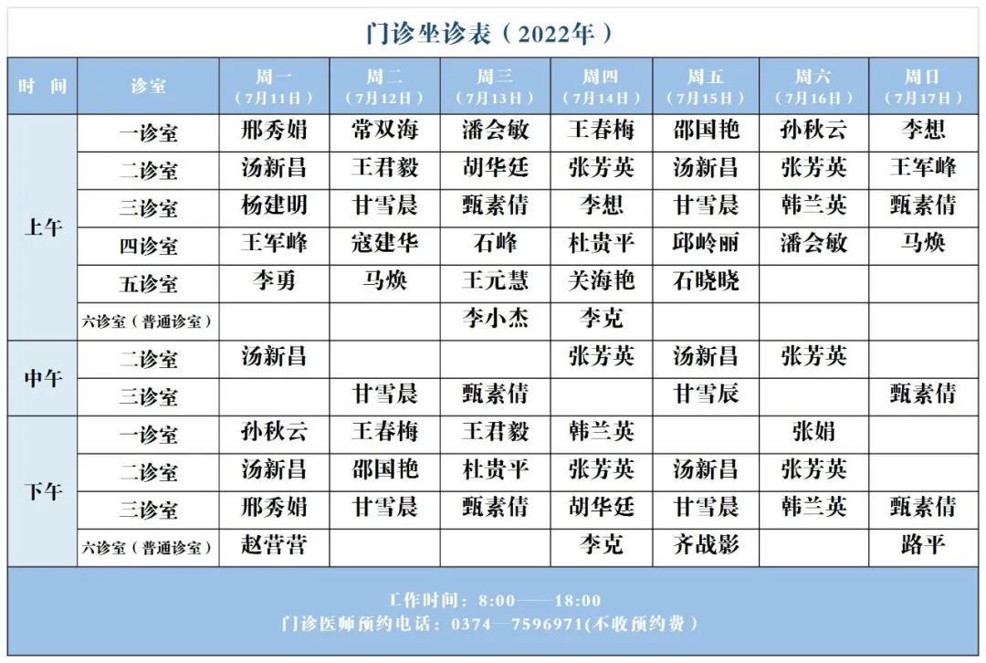 【坐诊信息】许昌市建安医院门诊坐诊表(2022年7月11日-7月17日)
