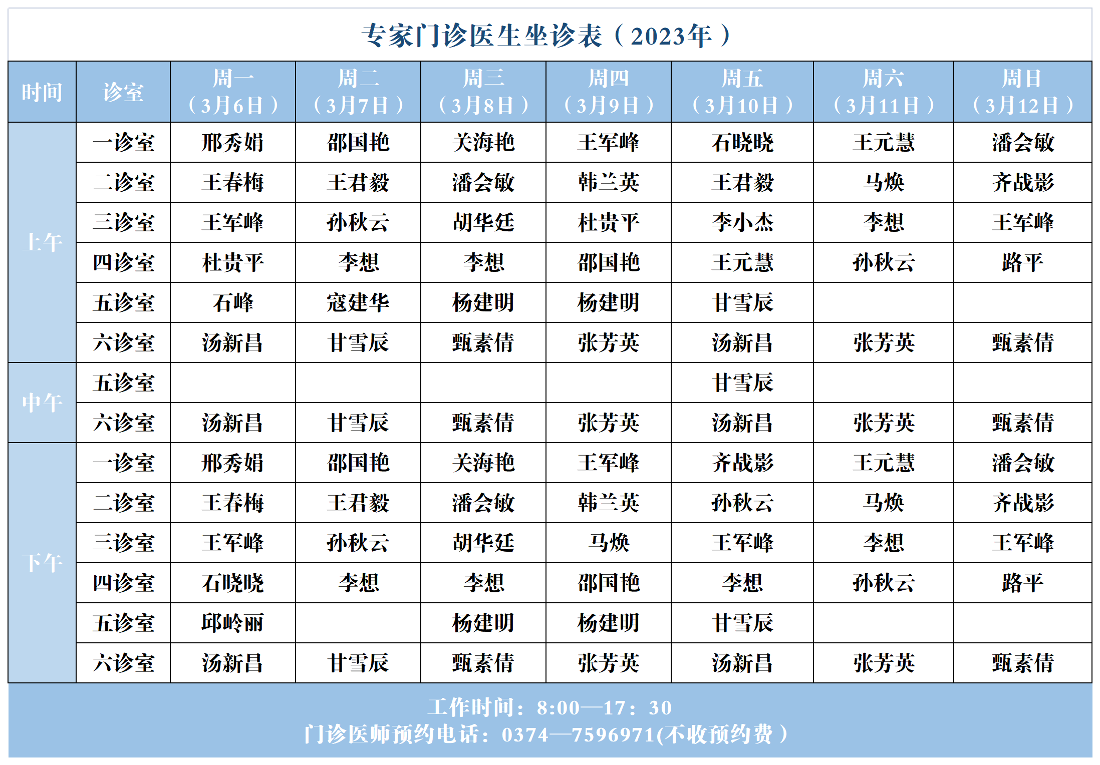 【坐诊信息】许昌市建安医院门诊坐诊表(2023年3月6日-2023年3月12日)