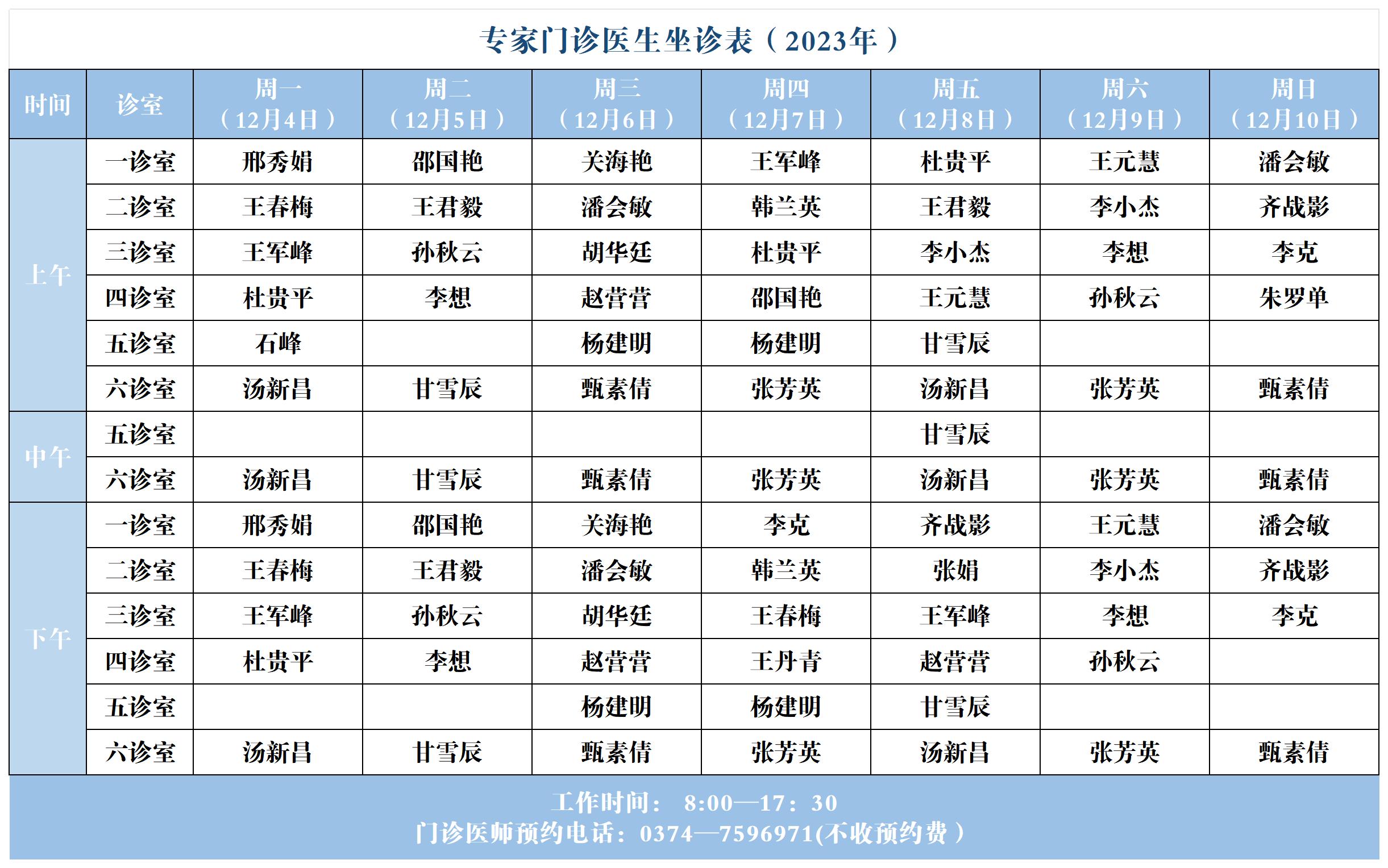 【坐诊信息】许昌市建安医院门诊坐诊表(2023年12月4日-12月10日)