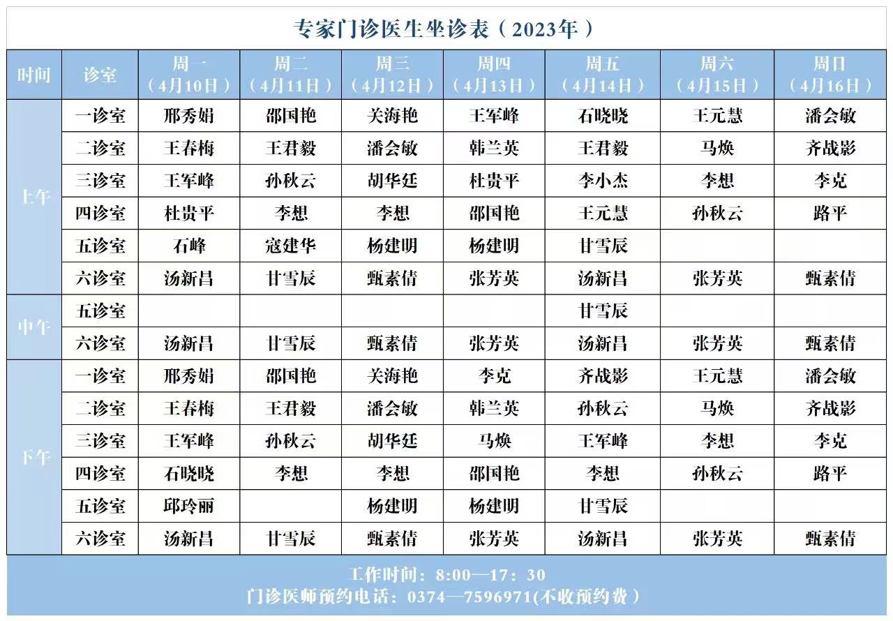 【坐诊信息】许昌市建安医院门诊坐诊表(2023年4月10日-2023年4月16日)