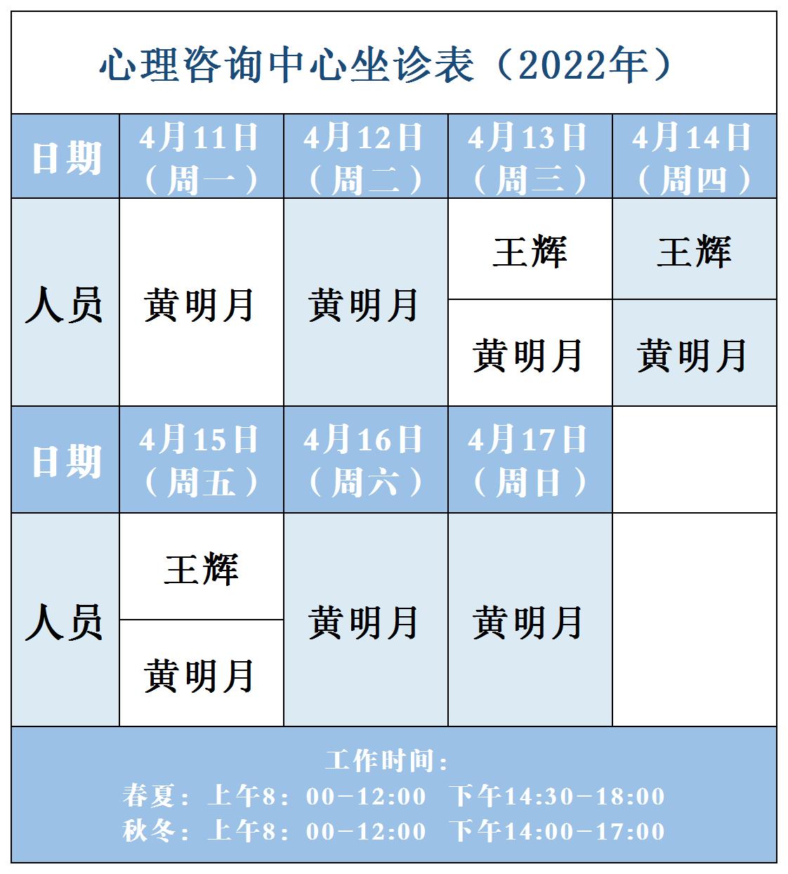 【坐诊信息】许昌市建安医院心理咨询中心坐诊表(2022年4月11日-4月17日)