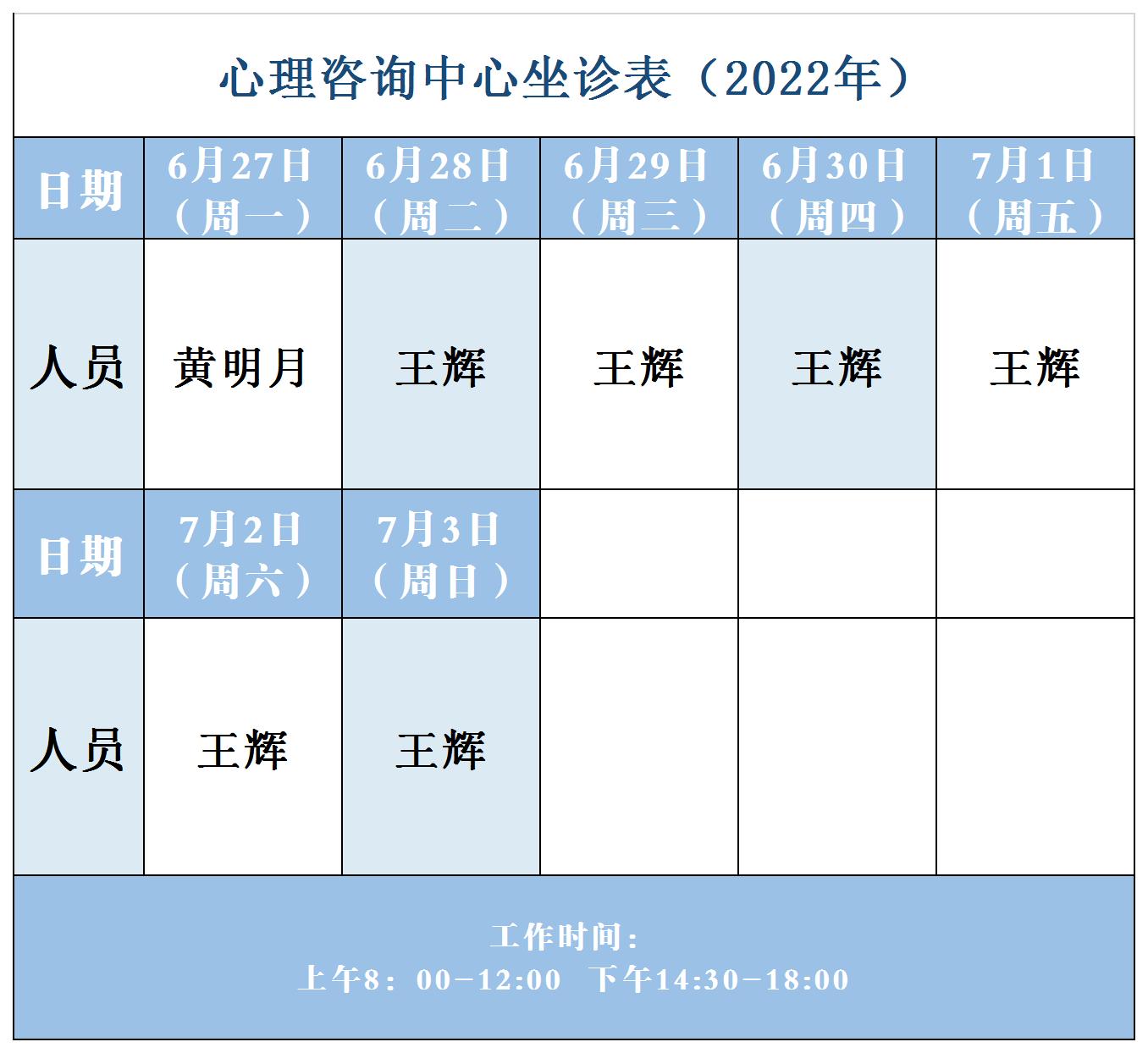 【坐诊信息】许昌市建安医院心理咨询中心坐诊表(2022年6月27日-7月3日)
