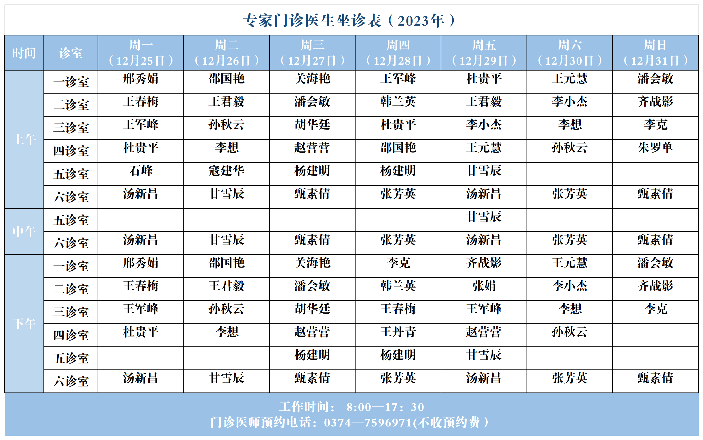 【坐诊信息】许昌市建安医院门诊坐诊表(2023年12月25日-12月31日)